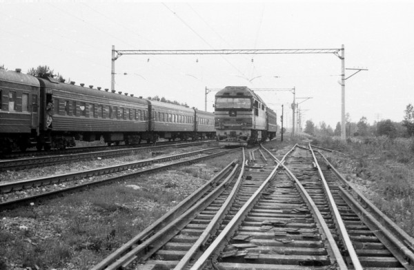 Встреча пассажирского поезда Москва-Бутырская (Савеловская) - Санкт-Петербург Витебский с пригородным поездом Гатчина - Мга по станции Пустынька |